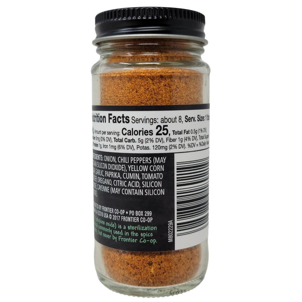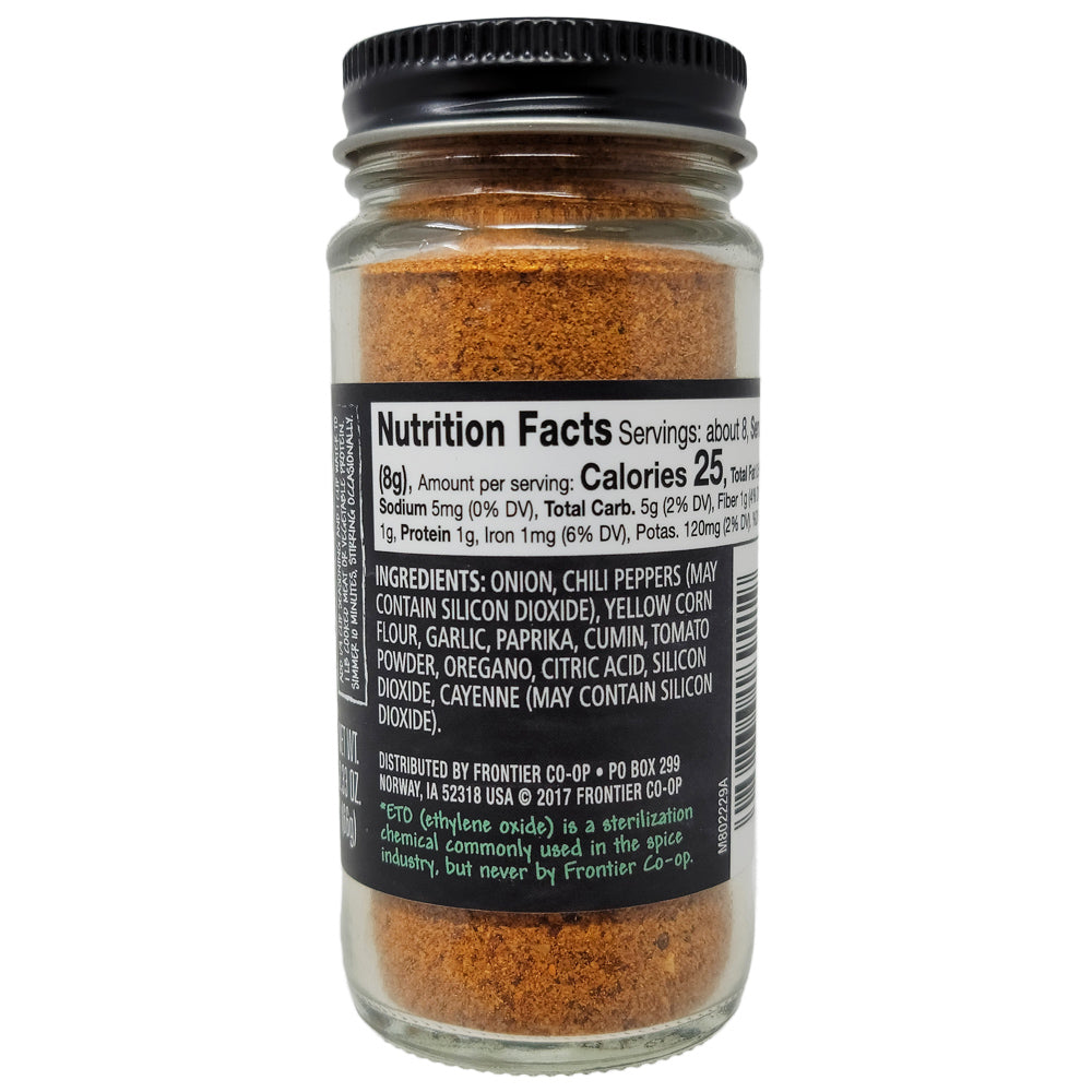 Ingredients: Onion, Chili Peppers (may contain silicon Dioxide), Yellow Corn Flour, Garlic, Paprika, Cumin, Tomato Powder, Oregano, Citric Acid, Silicon Dioxide, Cayenne (may contain silicon dioxide).