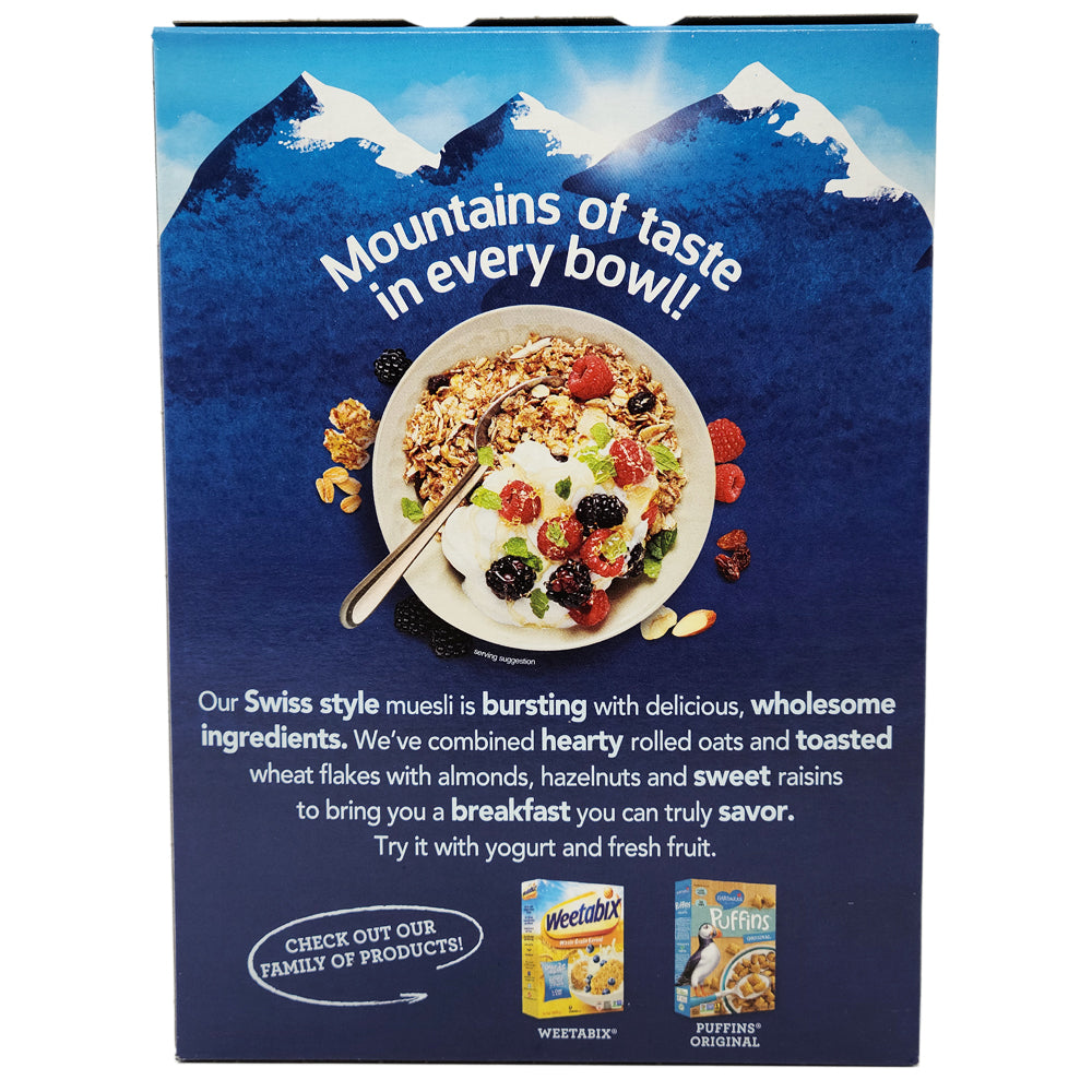 Our Swiss style muesli is bursting with delicious, wholesome ingredients. We've combined hearty rolled oats and toasted wheat flakes with almonds, hazelnuts and sweet raisins to bring you a breakfast you can truly savor. Try it with yogurt and fresh fruit.