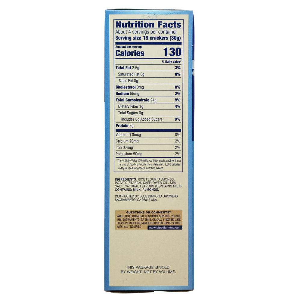Ingredients: Rice Flour, Almonds, Potato Starch, Safflower Oil, Sea Salt, Natural Flavors (contains Milk).