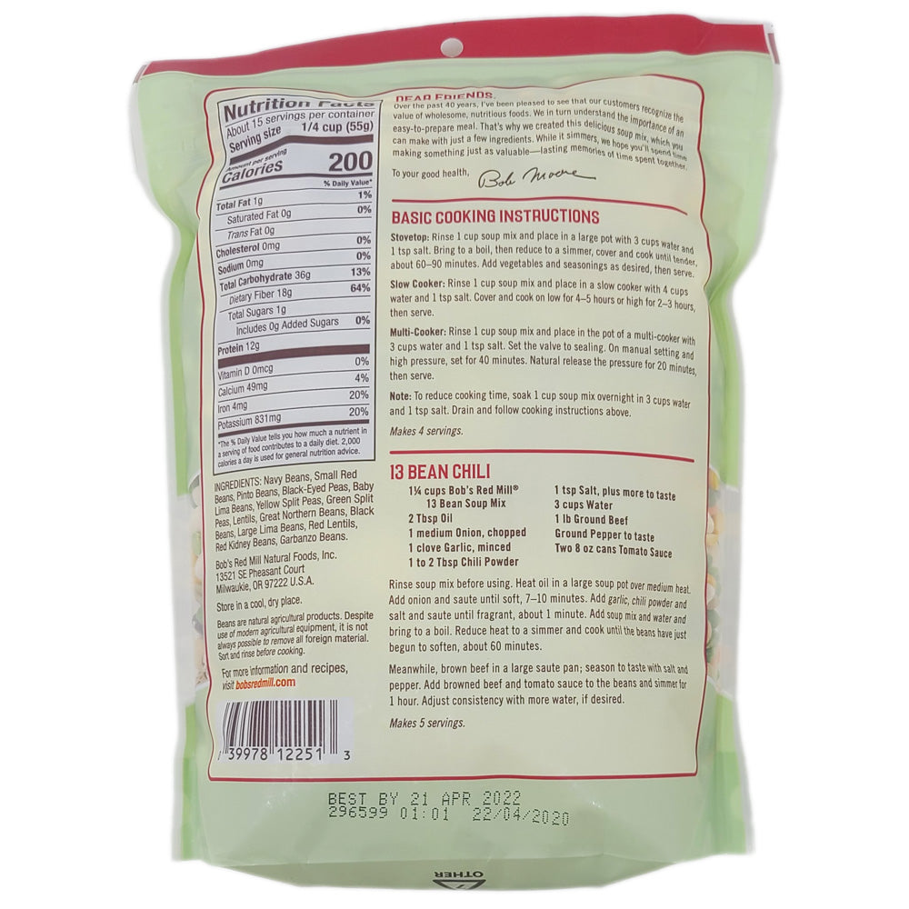 Bob's Red Mill 13 Bean Soup Mix is a delicious way to include the health benefits of beans in your diet. Beans are high in fiber, rich in protein, low in fat and contain no cholesterol. We have selected a unique, complementary blend of beans for soups and chilies with exceptionally rich flavor and wholesome stick-to-your-rib heartiness.Nutritional Facts: