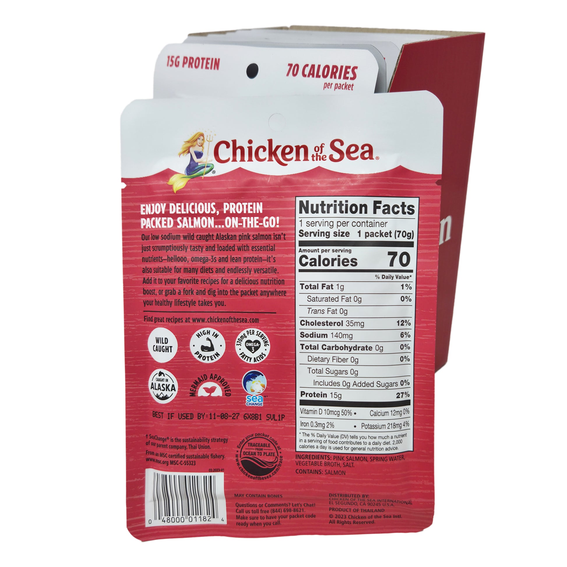Chicken of the Sea Low Sodium Wild Alaskan Pink Salmon is skinless and boneless and low in sodium! Enjoy delicious, protein packed salmon, on the go! Our low sodium wild caught Alaskan pink salmon isn't just scrumptiously tasty and loaded with essential nutrients - hellooo, omega-3s and lean protein - it's also suitable for many diets and endlessly versatile. Add it to your favorite recipes for a delicious nutrition boost, or grab a fork and dig into the packet anywhere your healthy lifestyle takes you. Wild caught, high in protein, caught in Alaska, and each pouch is traceable from ocean to plate.
