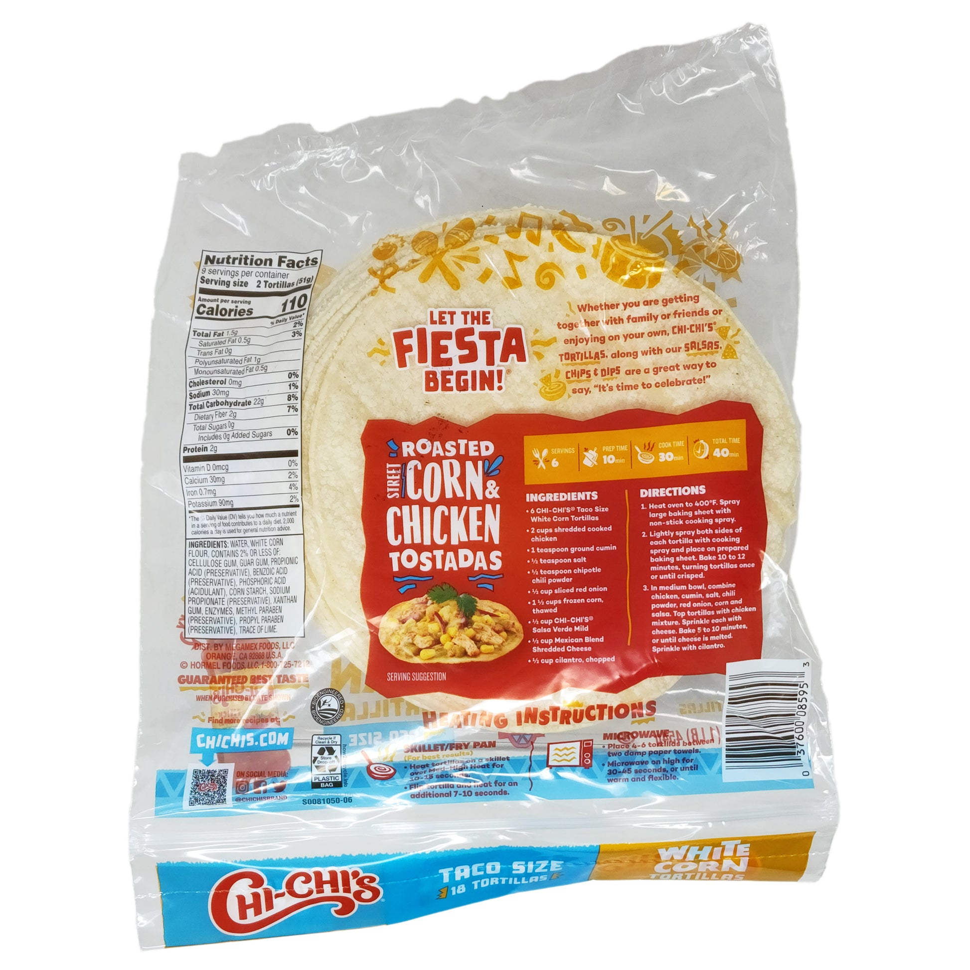 Chi-Chi's White Corn Taco Style Tortillas are gluten free and are perfect for your taco night! Only 15mg of sodium per two (2) tortillas. Package includes recipes for Huevos Ranchers and Cheesy Chicken Flautas! Package includes 18 tortillas