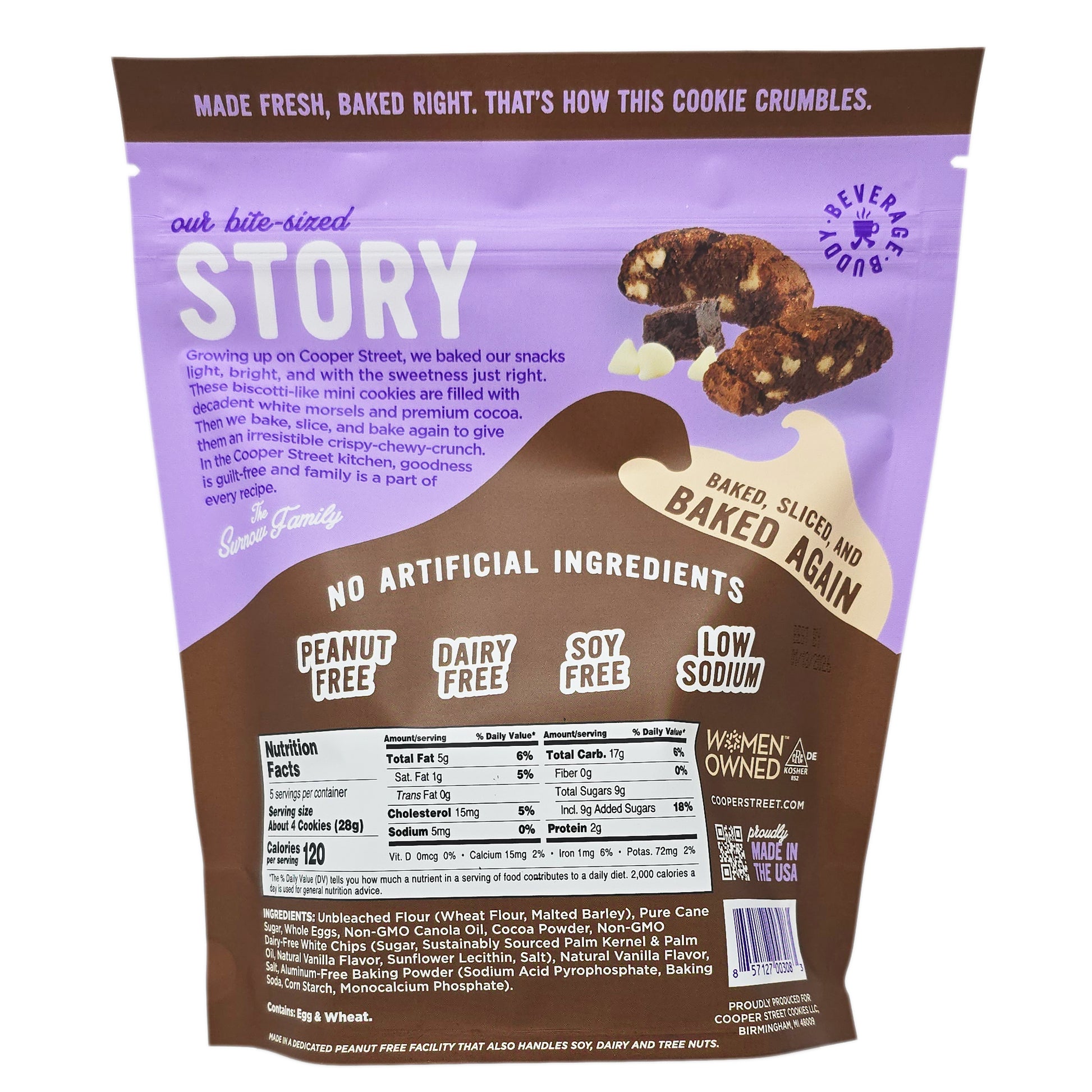 Cooper Street Snacks Twice Baked Brownie Chocolate Crunch Cookies are loaded with premium cocoa & white morsels. Nothing artificial - peanut free, dairy free, soy free, and low sodium! These biscotti-like mini cookies are filled with decadent white morsels and premium cocoa. Then we bake, slice, and bake again to give them an irresistible crispy-chewy-crunch. In the Cooper Street kitchen, goodness is guilt-free and family is part of every recipe.