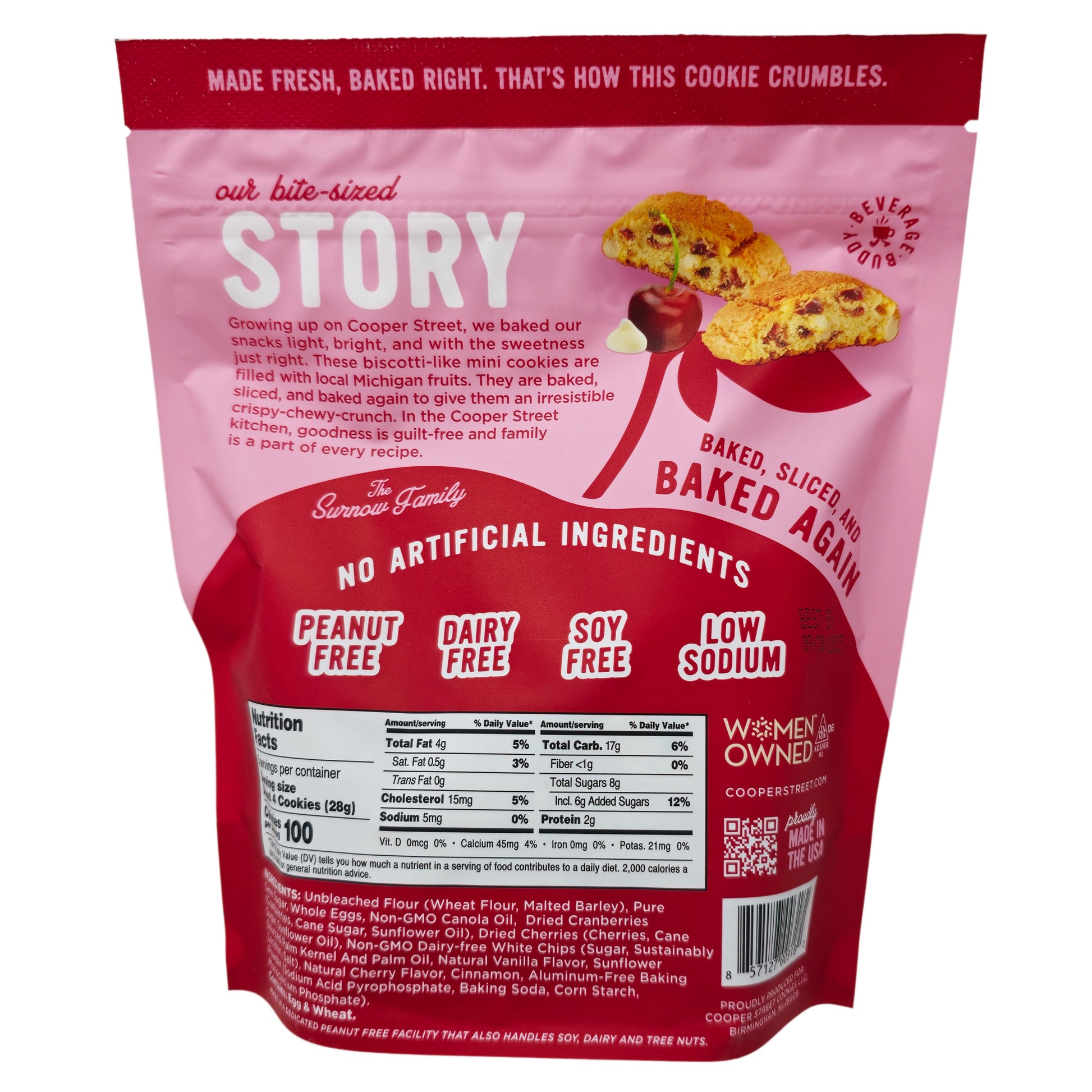 Cooper Street Snacks Mini Twice Baked Cherry White Chip Cookies are loaded with real Michigan cherries! Nothing artificial - peanut free, dairy free, soy free, and low sodium! These biscotti-like mini cookies are filled with local Michigan fruits. They are baked, sliced, and baked again to give them an irresistible crispy-chewy-crunch. In the Cooper Street kitchen, goodness is guilt-free and family is part of every recipe.