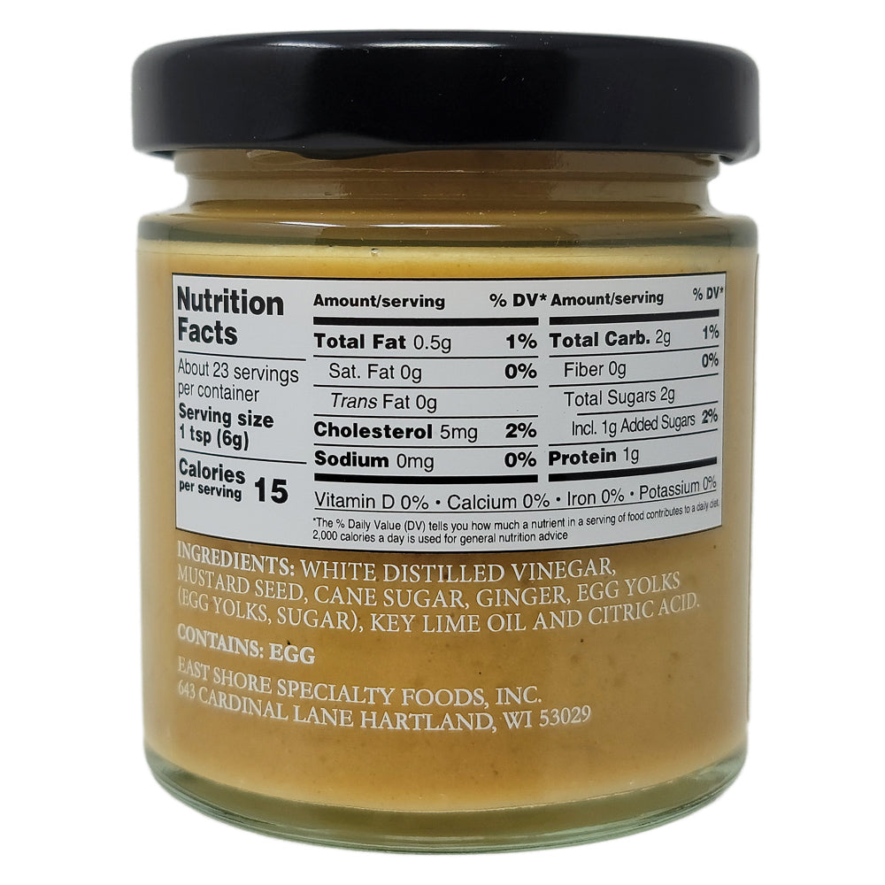 Ingredients: White Distilled Vinegar, Mustard Seed, Cane Sugar, Ginger, Egg Yolks (Egg Yolks, Sugar), Key Lime Oil and Citric Acid.