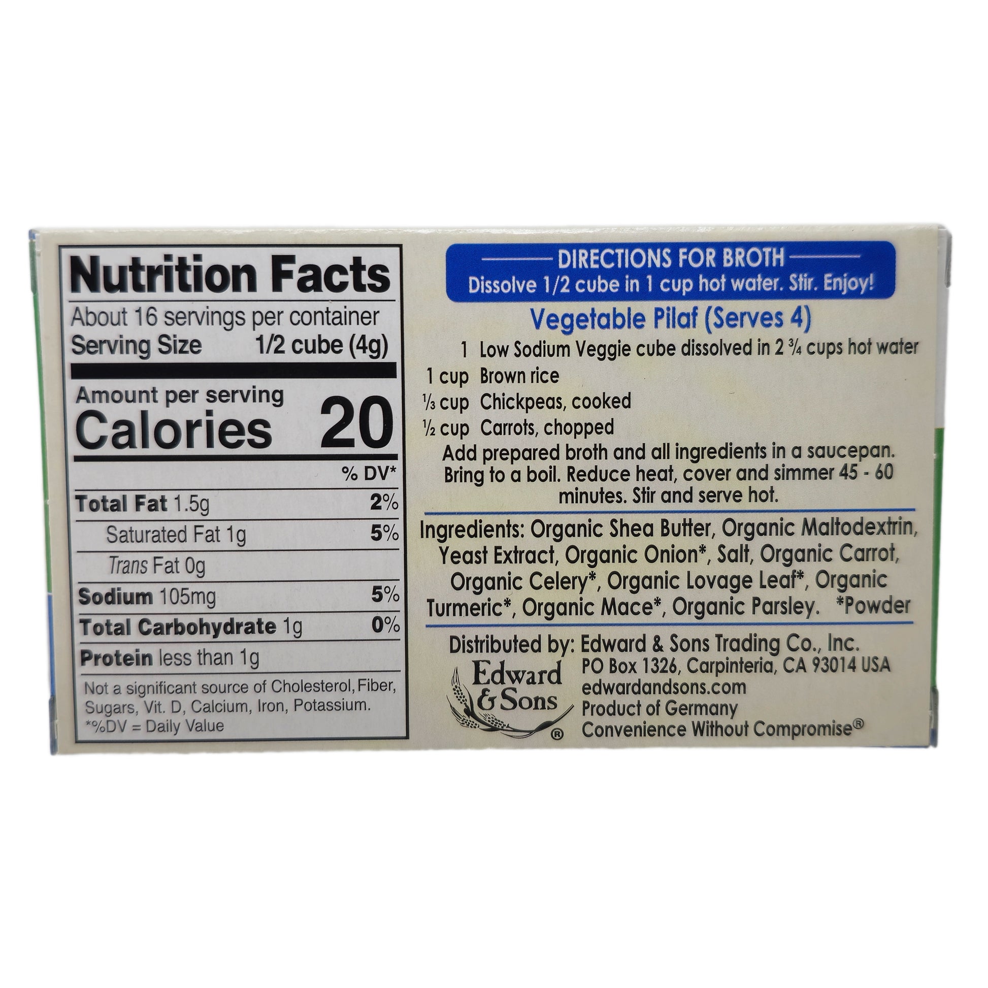 Edward & Sons Low Sodium Garden Veggie Bouillon Cubes are vegan, gluten free, plant-based, and palm oil free! Box includes 8 bouillon cubes. Make wholesome, satisfying broth in seconds - just add hot water. Their rich, full-bodied flavor enhances soups, stews, sauces and more! Store in a cool dry place.