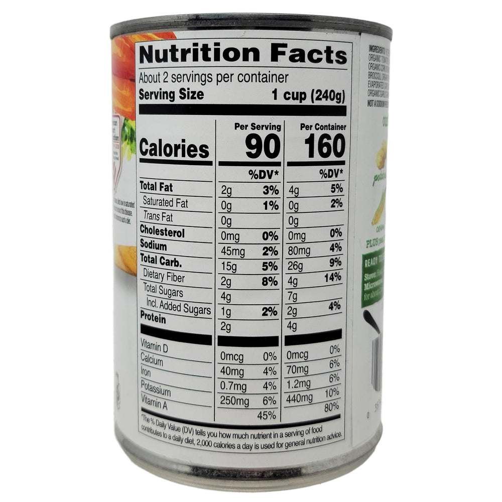 Ingredients: Filtered Water, Organic Potatoes, Organic Carrots, Organic Celery, Organic Tomatoes in Organic Tomato juice, Organic Peas, Organic Green Beans, Organic Corn, Organic Onions, Organic Tomato Paste, Organic Corn Starch, Organic Broccoli, Organic Red Kidney Beans, Organic Expeller Pressed Canola Oil, Organic Evaporated Cane Juice, Organic Spinach, Organic Onion Powder, Organic Garlic Granules, Organic Spices, Organic Concentrated Lemon Juice, Vitamin a Palmitate.