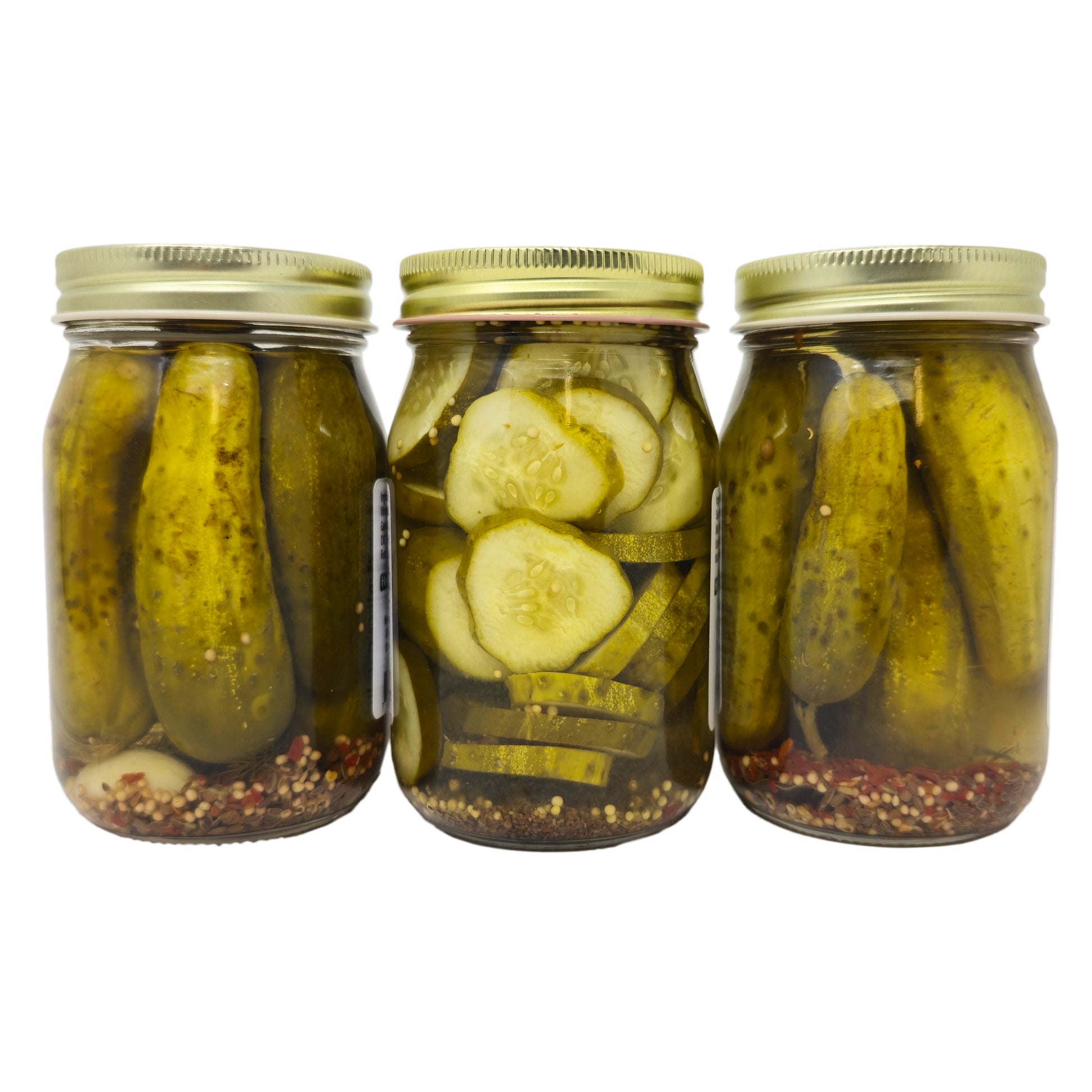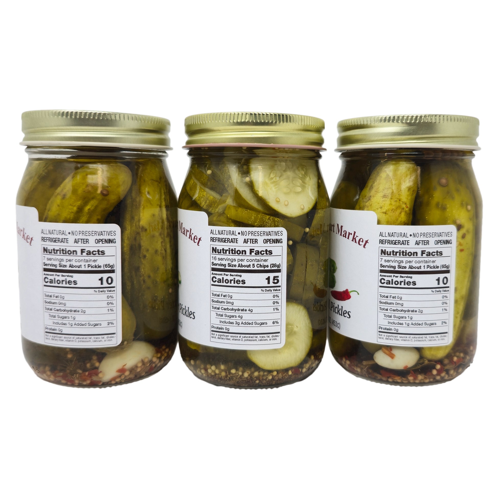 3 pack includes: (1) jar Healthy Heart Market Sodium Free Dills , (1) jar Healthy Heart Market Sodium Free Bread and Butter Pickle Chips, and (1) jar Healthy Heart Market Sodium Free Spicy Dills