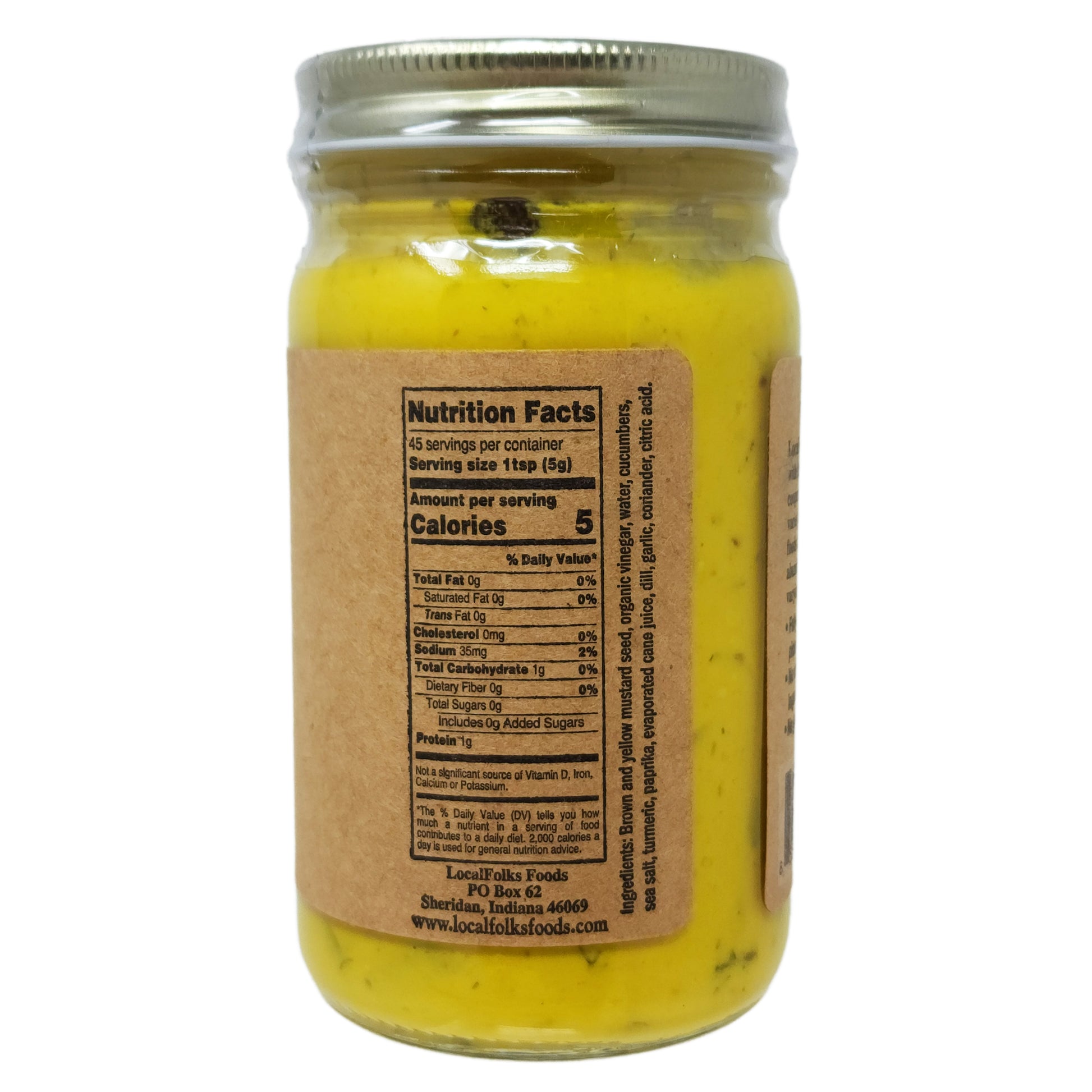 Ingredients: Brown and Yellow Mustard Seed, Organic Vinegar, Water, Cucumbers, Sea Salt, Turmeric, Paprika, Evaporated Cane Juice, Dill, Garlic, Coriander, Citric Acid