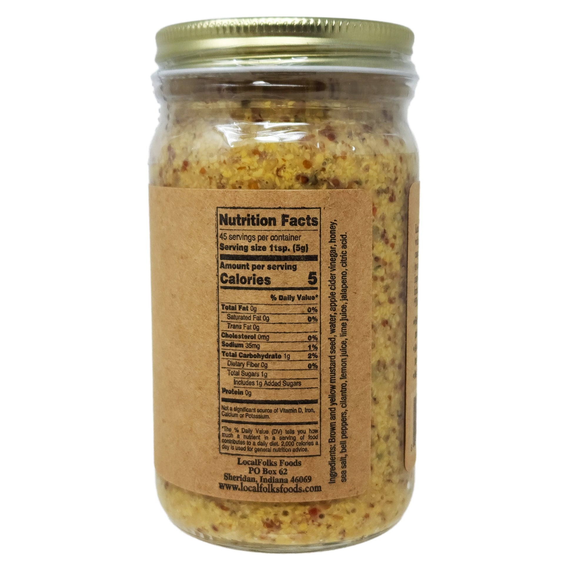 Ingredients: Brown and Yellow Mustard Seed, Water, Apple Cider Vinegar, Honey, Sea Salt, Bell Peppers, Cilantro, Lemon Juice, Jalapeno, Citric Acid