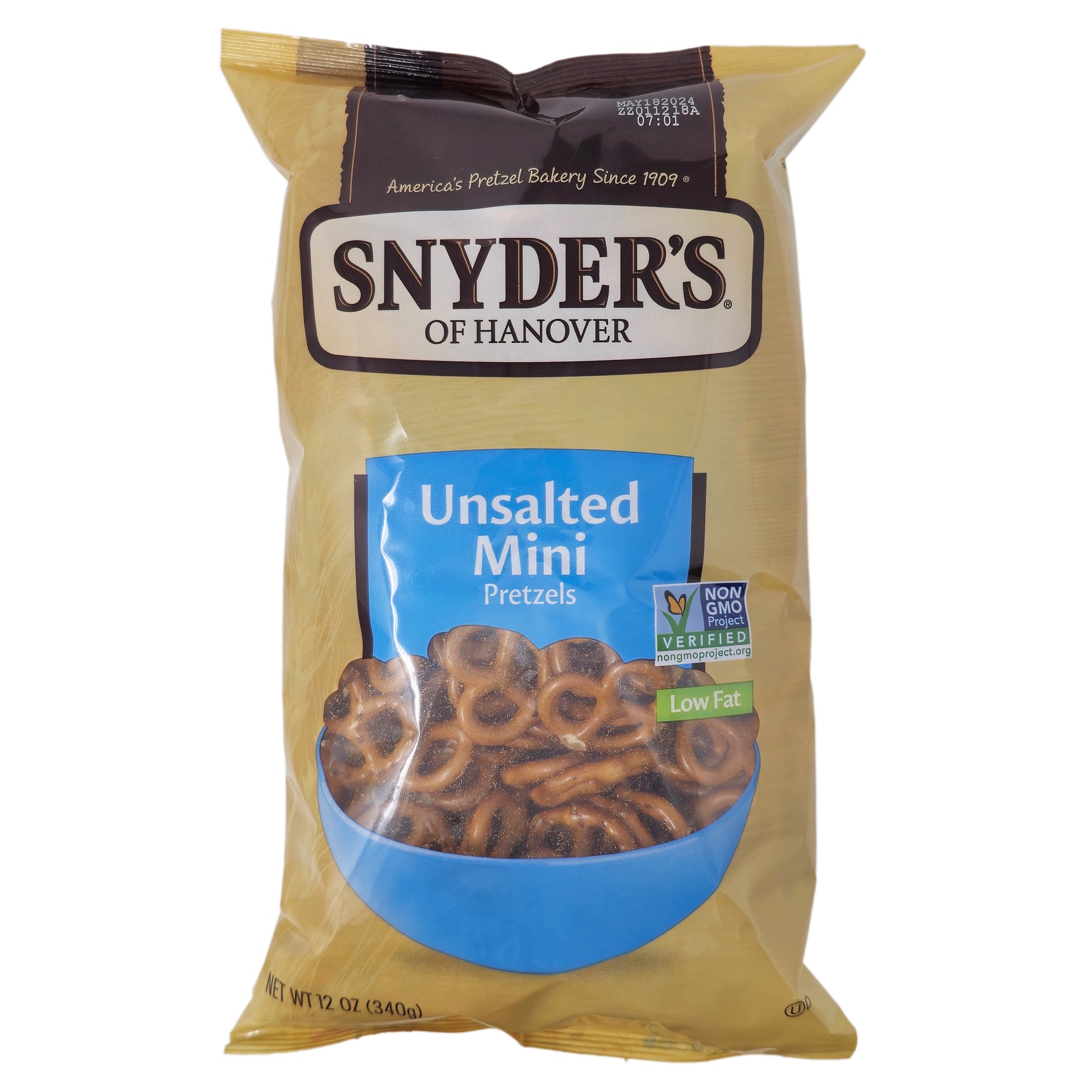 They're bit-sized, they're crunchy, they're delicious! Just what you expect from a Snyder's of Hanover Unsalted Mini Pretzel. Perfect on their own or with cheese or hummus for a tasty snack - so many ways to enjoy! Non-GMO and low fat with 90mg of sodium per serving!