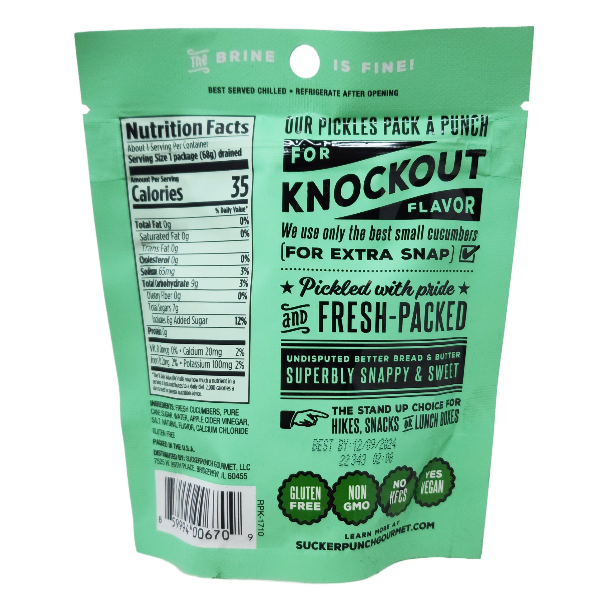Suckerpunch Gourmet Snappy Sweet Bread & Butter Pickle Pack is a single serve pouch made just for snacking! No glass or plastic jars to worry about. Suckerpunch Gourmet pickles pack a punch. For knockout flavor, they use only the best small cucumbers (for extra snap). Pickled with pride and fresh-packed. The stand up choice for hikes, snacks. or lunch boxes! Gluten free, Non-GMO, No HFS, and Vegan! Only 65mg of sodium per pack!