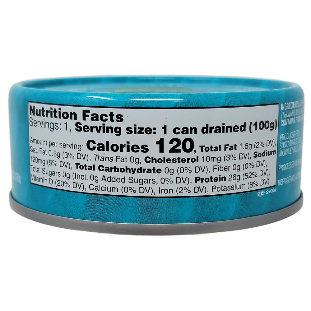 Sustainable Seas is 100% pole and line caught - no nets, non-GMO, and non-BPA lining used. Research shows that smaller albacore, such as used by Sustainable Seas, contain less mercury than larger albacore. Only 120mg of sodium per can!