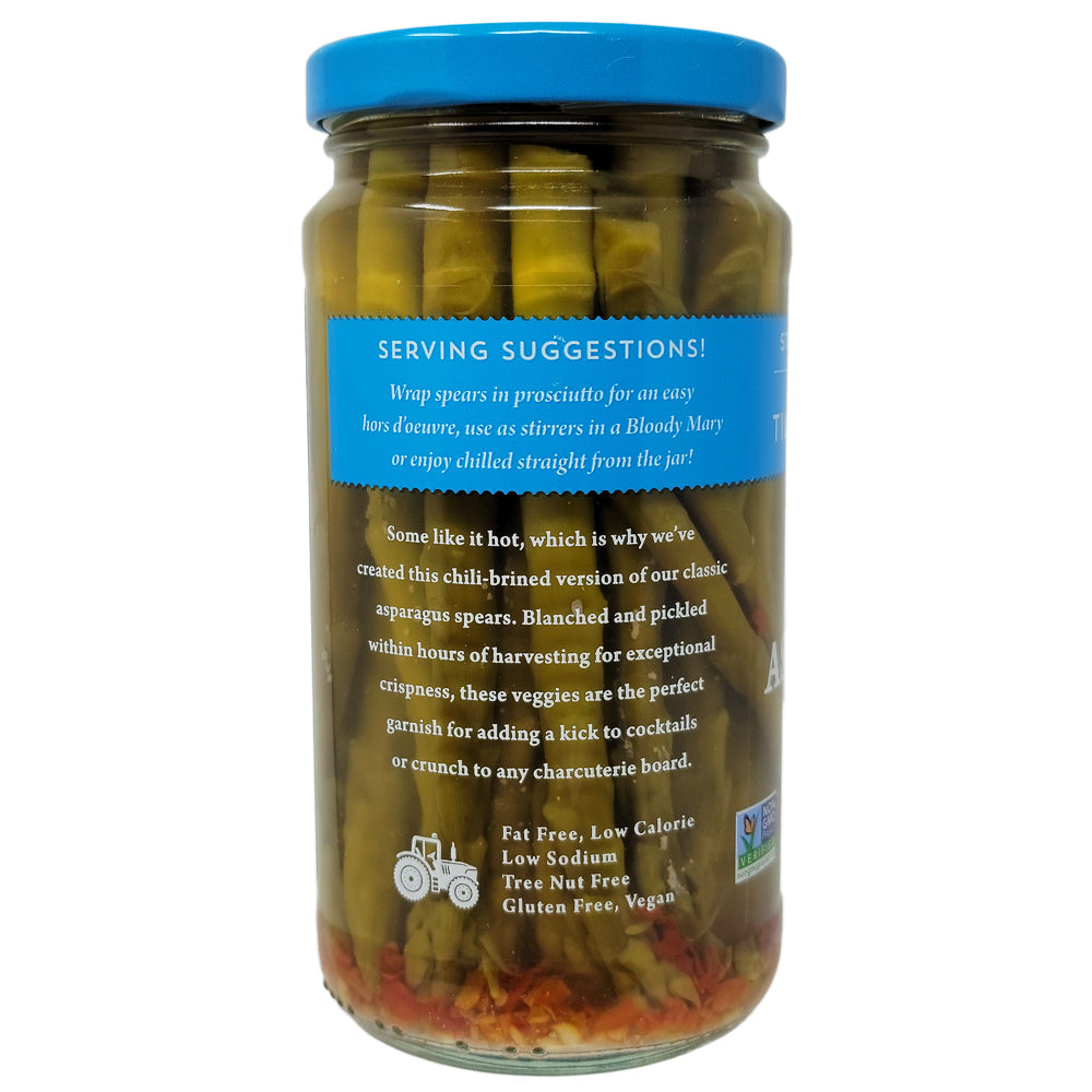 Some like it hot, which is why we've created this chili-brined version of our classic asparagus spears. Blanched and pickled within hours of harvesting for exceptional crispness, these veggies are the perfect garnish for adding a kick to cocktails or cruch to any charcuterie board.