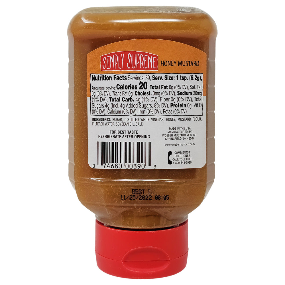 Ingredients: Sugar, Distilled White vinegar, Honey, Mustard Flour, Filtered Water, Soybean Oil, Salt.